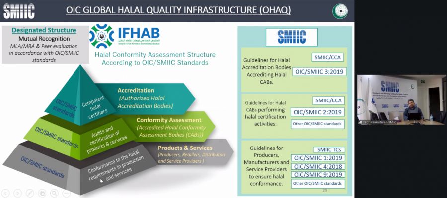 • Overview of the OIC Global Halal Quality Infrastructure (OHAQ), OIC/SMIIC Standards for Halal Certification, and SMIIC Conformity Assessment System and related standards, delivered by Mr. Çağrı Cankurtaran, Specialist and Secretary of the SMIIC Conformity Assessment Committee,